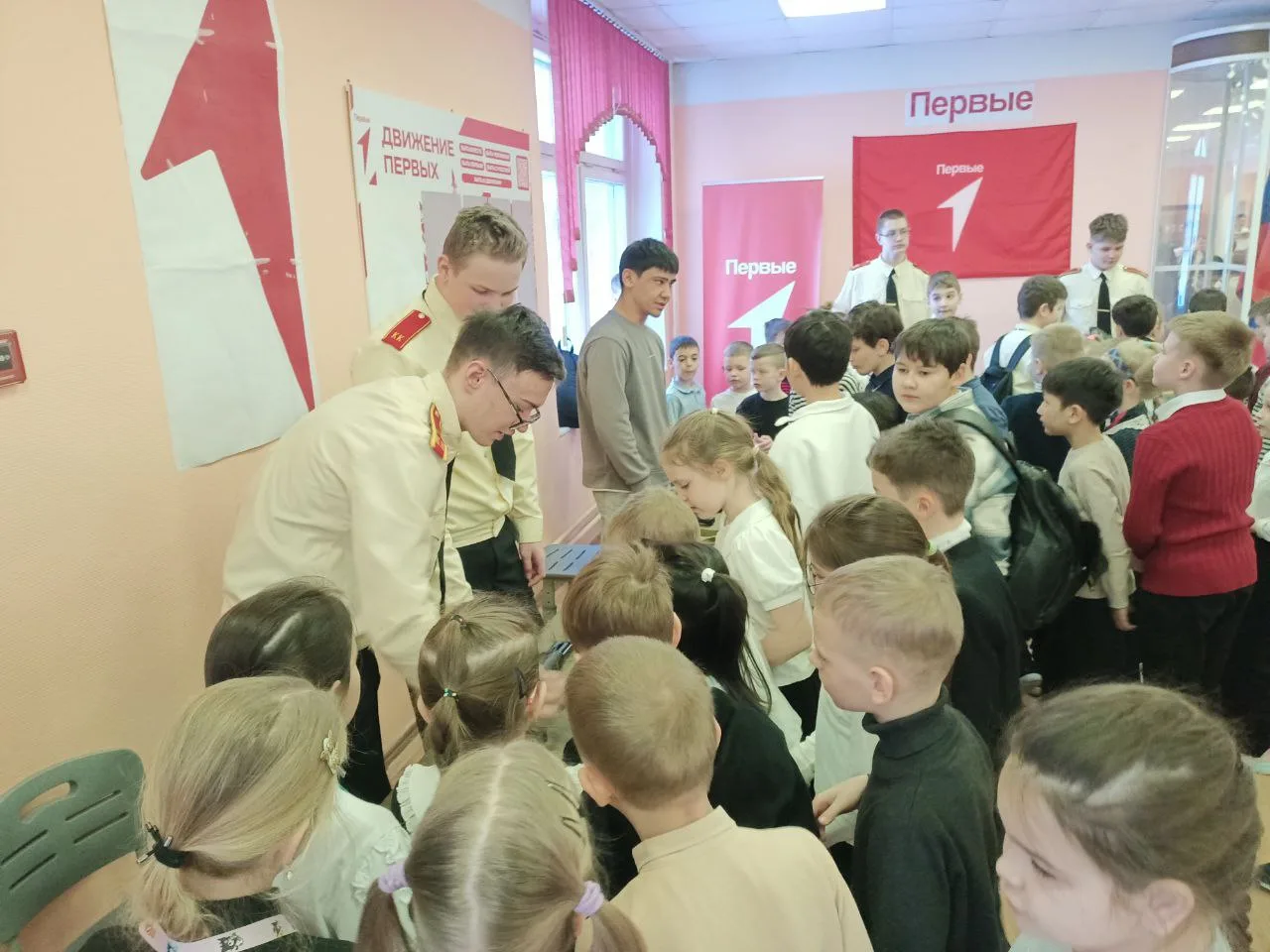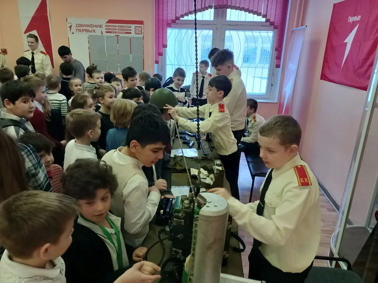 Кадеты и активисты Российского движения детей и молодёжи Движение первых организовали мастер-классы в фойе 1 этажа.